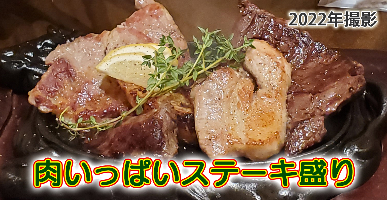 肉いっぱいステーキ盛り。牛肉豚肉鶏肉のよくばり盛り!