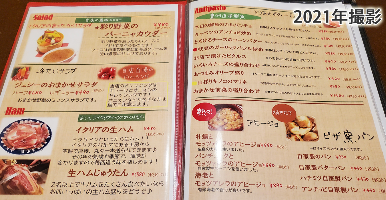 メニュー。自家製バーニャカウダー・自家製ドレッシングのサラダ・生ハム・前菜・アヒージョ・自家製ピザ釜パン