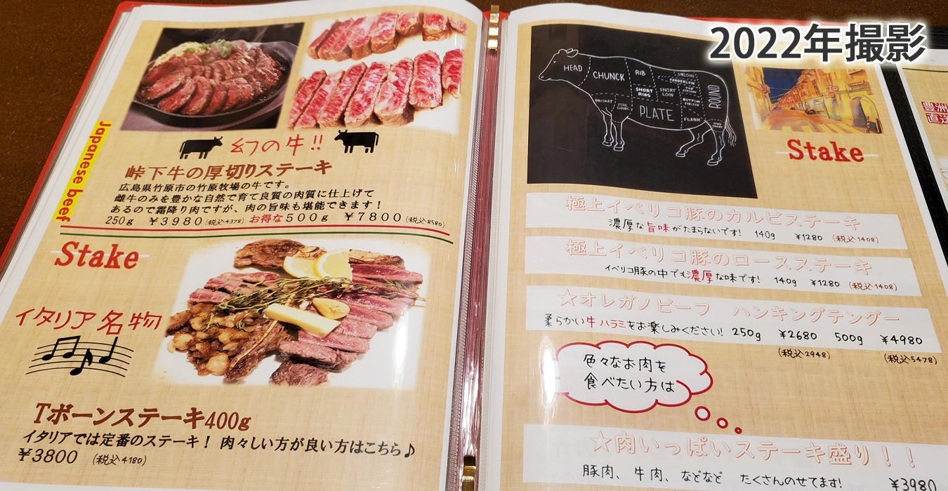 メニュー。季節メニュー、グラタン・パスタ・前菜など。極上イベリコ豚のステーキとか。