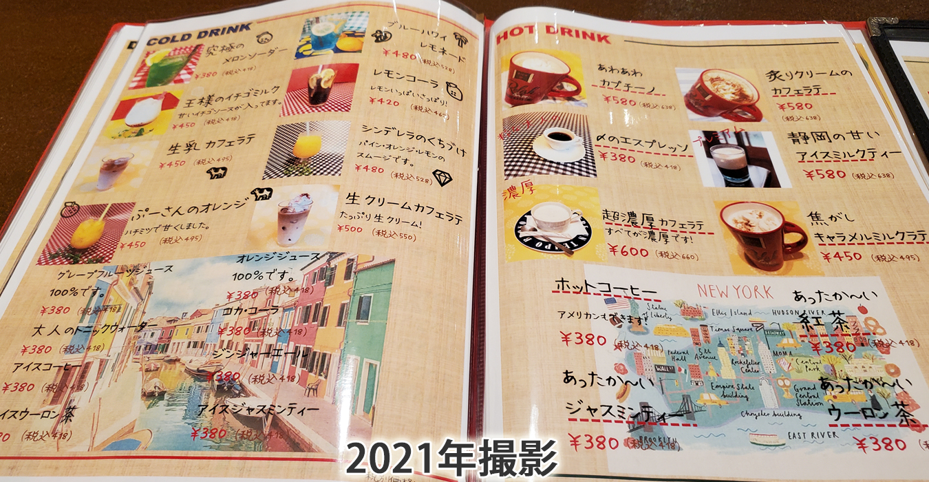 ドリンクメニュー。コーヒー・ティー・ジュースなどのソフトドリンクも手抜き無し!