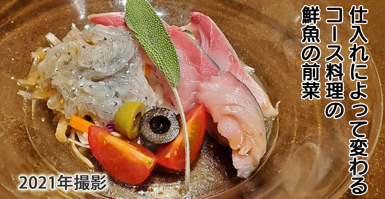 ある日のコース料理の海鮮の前菜。豊洲で直接新鮮食材を仕入れ。日によって内容が変わります。