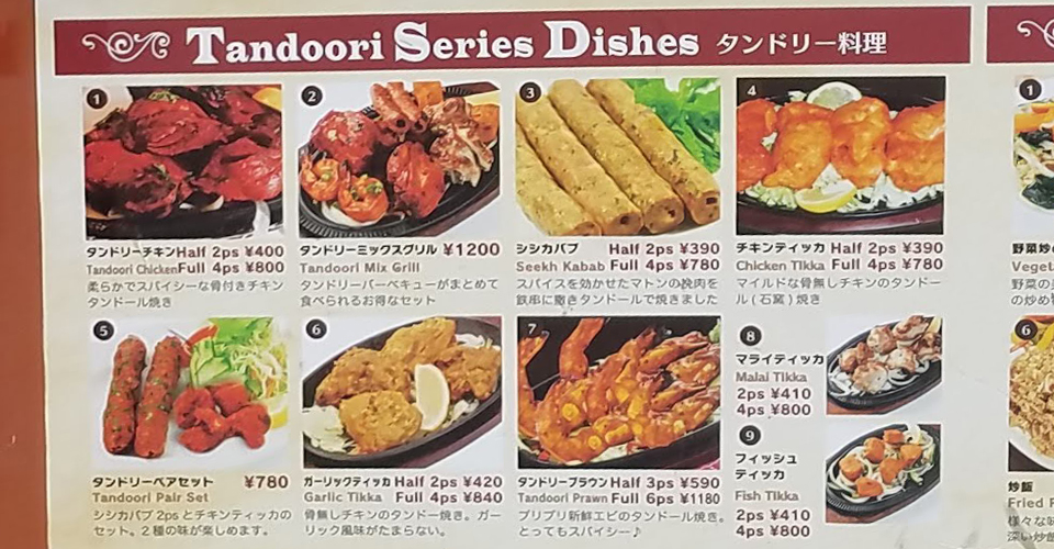 インド料理・タンドリーメニュー。タンドリーチキン・シシカバブなど