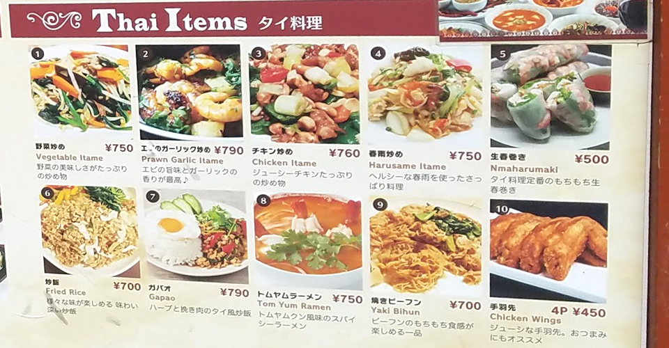 タイ料理メニュー。ガパオ・トムヤムラーメンなど。おつまみ・一品料理