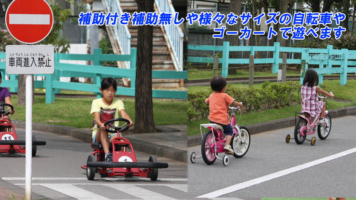入場料無料。交通ルールを学びながら、自転車やゴーカートなどで楽しく遊べます。ミニSLは土日祝運行。駐車場はないみたいだから気をつけてね。